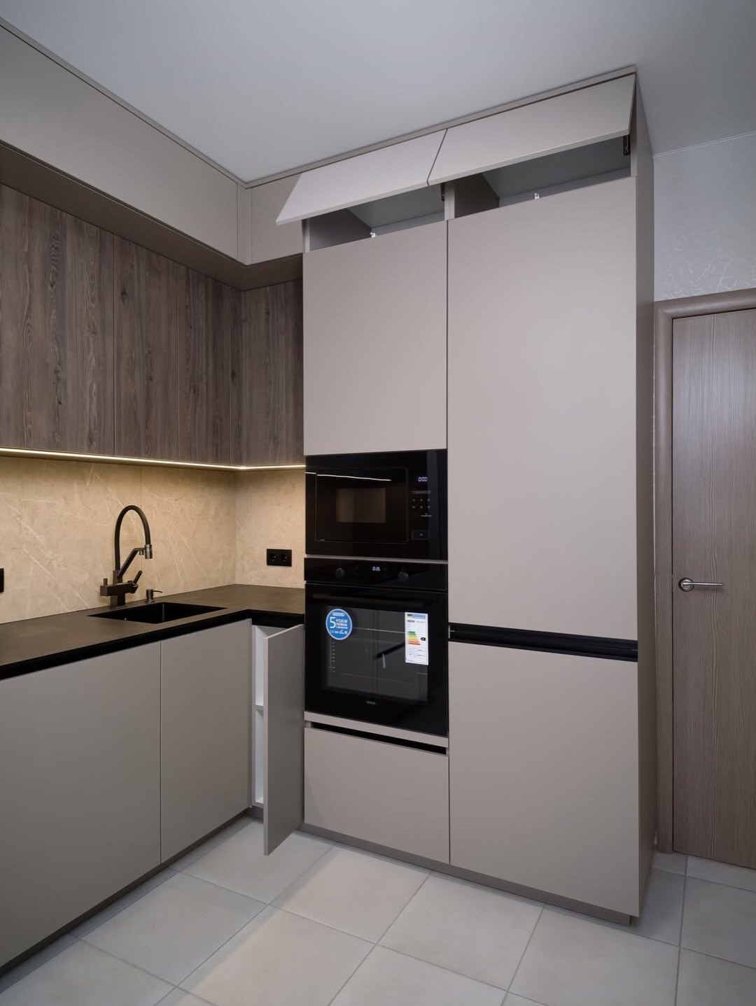 Лаконичная Г-образная кухня с акцентом на удобство и визуальную «чистоту». Сделали ровные плоскости без ручек, спрятали технику в высокие пеналы, добавили тёплое дерево в верхнем ярусе и подсветку по рабочей зоне — так кухня выглядит спокойной, но не холодной.