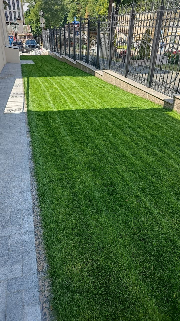 Укладка газона в санатории «Нарзан» Ранее участок представлял собой вытянутую зону с неровным основанием и слабой декоративностью. Наша задача — создать аккуратное, ровное и визуально «чистое» пространство, которое станет частью комфортной прогулочной территории санатория. Мы выполнили подготовку основания, выровняли поверхность, сформировали правильные уклоны для отвода воды и произвели укладку рулонного газона. В результате участок получил ухоженный, насыщенно-зелёный вид, чёткую геометрию и гармонично вписался в существующее благоустройство. Готовое решение подчёркивает статус объекта и повышает общее качество среды для отдыхающих.