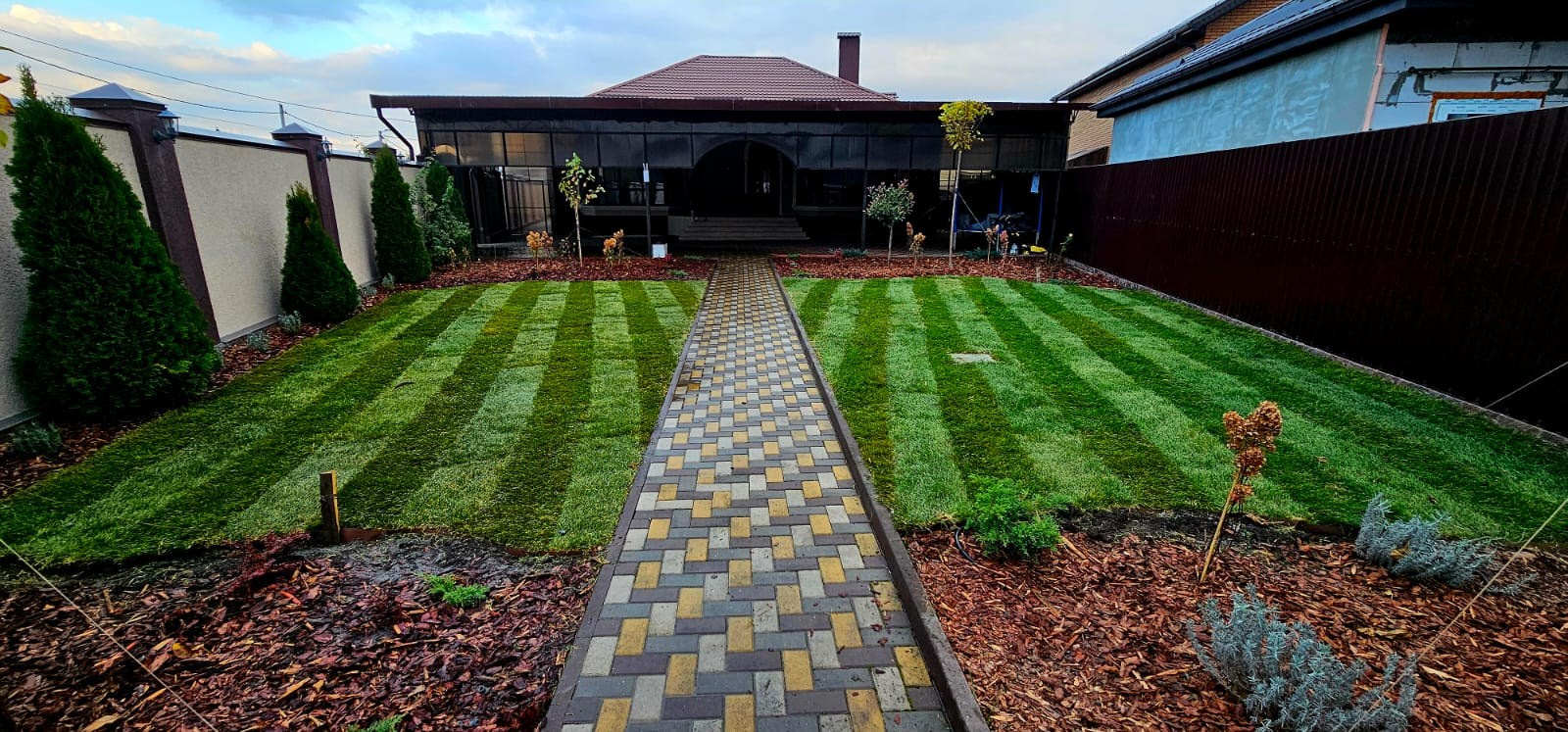 Дорожки, газон, посадки и аккуратные примыкания. Реальный результат с этапами работ и финальными фото.