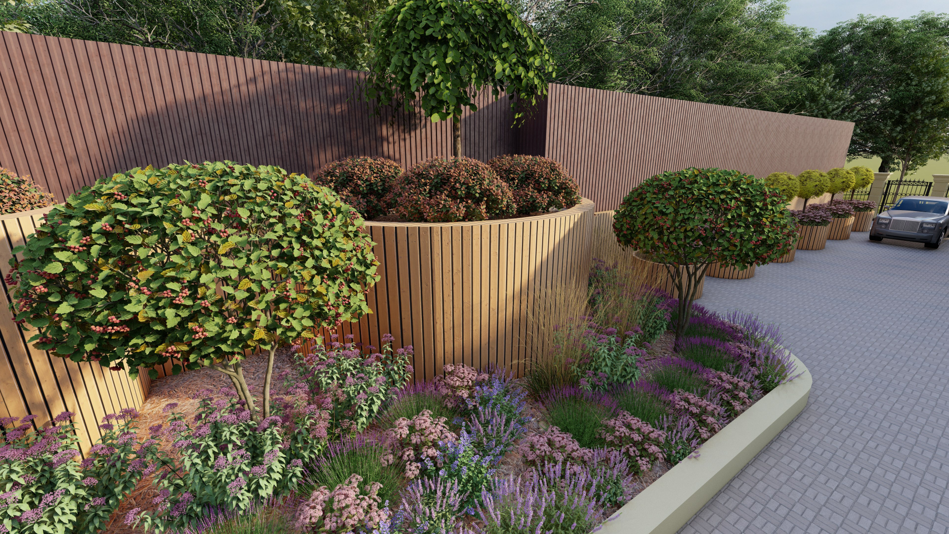 Для участка разработан индивидуальный проект благоустройства. Продуманы зонирование, композиции цветников и размещение зелёных акцентов. В рамках реализации выполнены посадки растений с учётом сезонной декоративности и гармоничных сочетаний. Пространство приобрело целостный, ухоженный и современный облик.