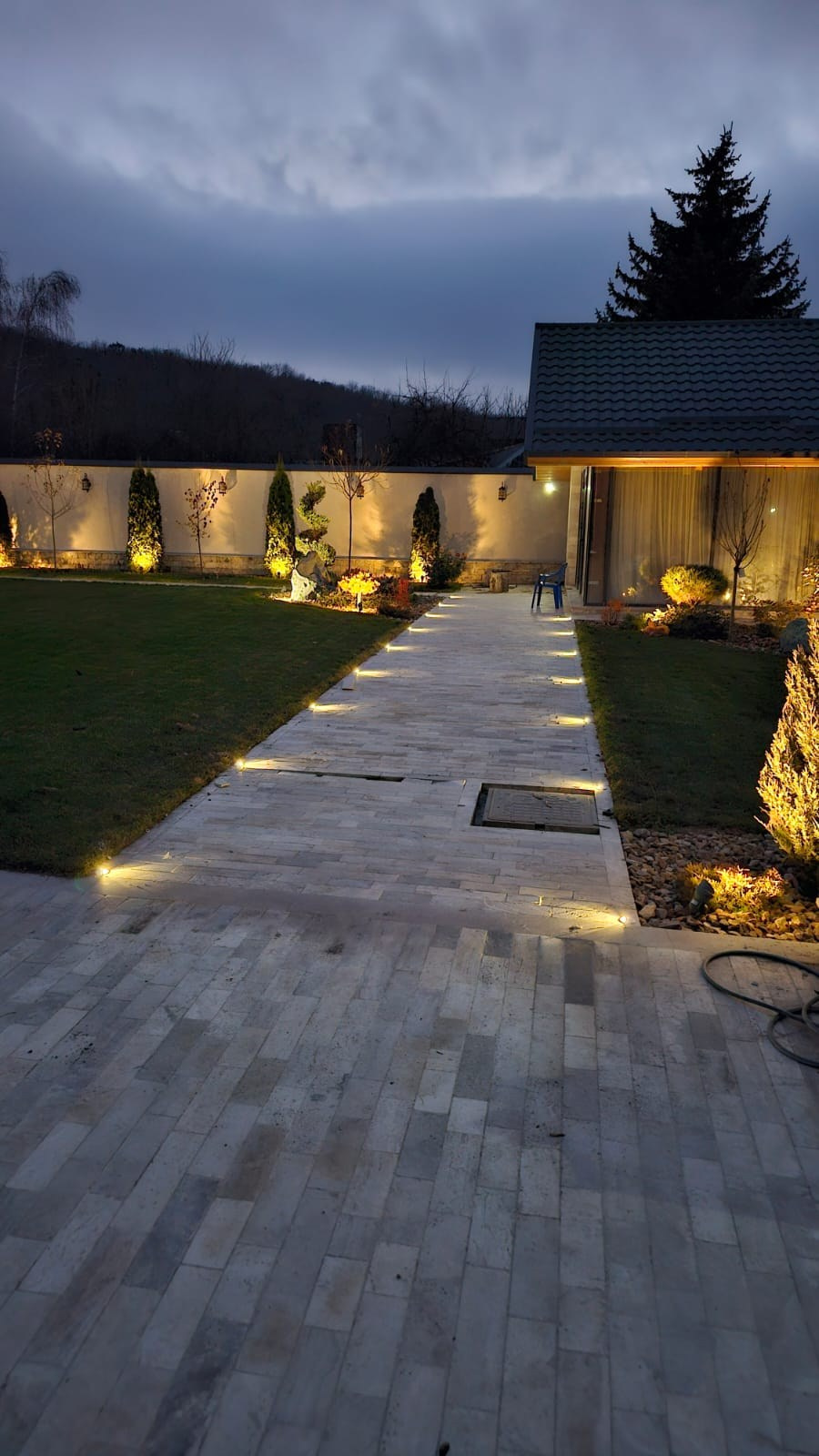 1. Мощение: устройство основания, монтаж тротуарной плитки, формирование дорожек и функциональных зон, выравнивание уровней и аккуратные примыкания к дому и ограждению 2. Озеленение: Посадка декоративных кустарников, формирование композиционных групп, дополнение существующих растений, мульчирование приствольных кругов 3. Газон: подготовка грунта, выравнивание территории, посев/укладка газона, формирование аккуратных границ 4. Освещение: установка ландшафтных светильников, подсветка фасада и растений, организация вечернего сценария освещения